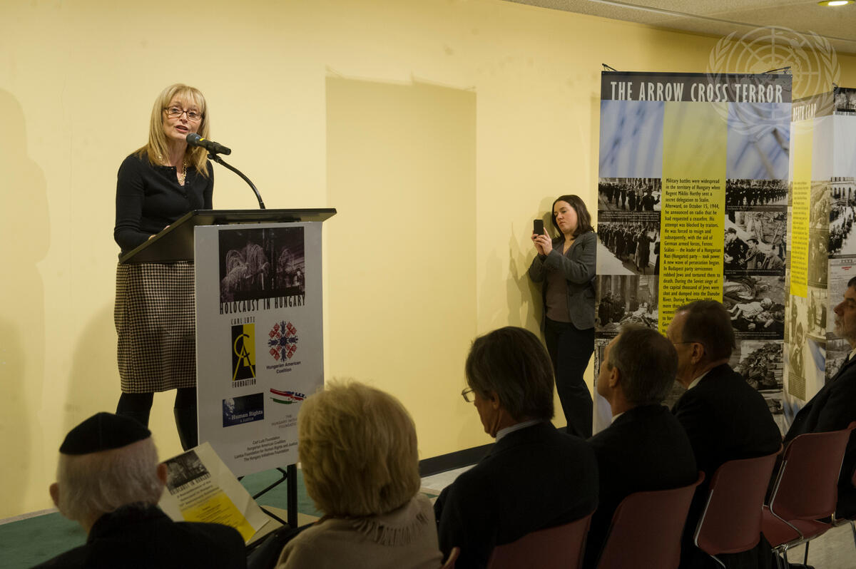 Katrina Lantos Swett, President of the Lantos Foundation for Human Rights and Justice, delivers remarks at the opening of an historical exhibition on the Holocaust in Hungary in observance of the 70th anniversary of the deportation and extermination of the Hungarian Jews. The event was organized by the Carl Lutz Foundation, Budapest, The Lantos Foundation for Human Rights and Justice and the Hungarian American Coalition, with additional support from The Hungary Initiatives Foundation and the Permanent Mission of Hungary to the United Nations.