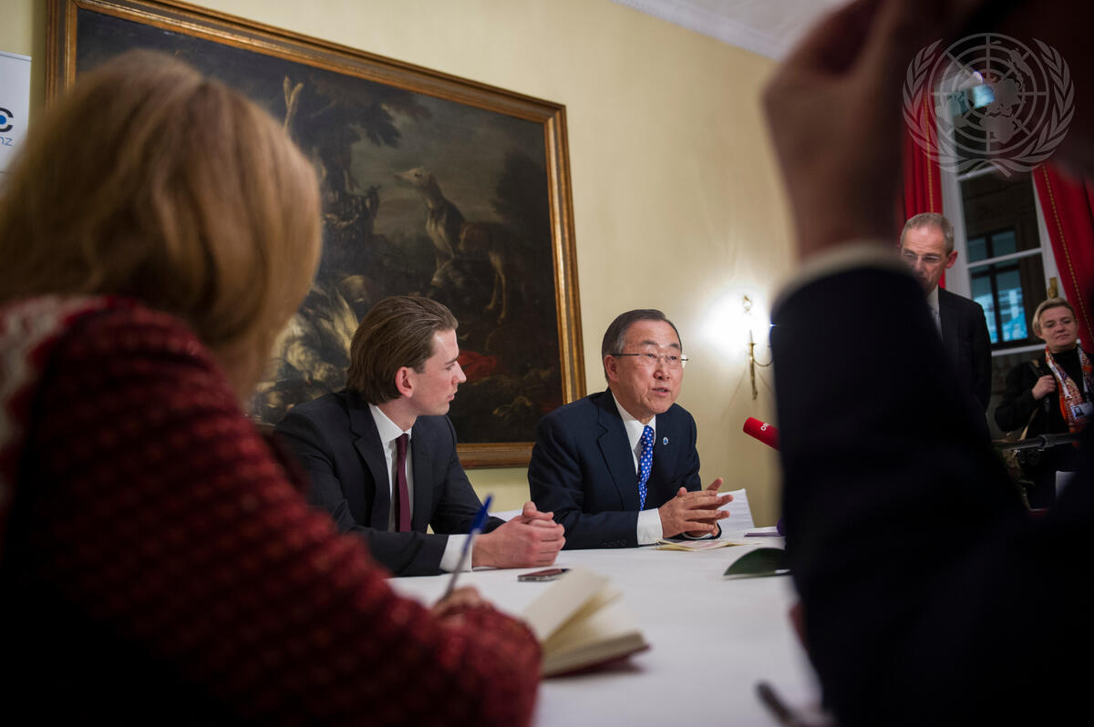 Secretary-General Ban Ki-Moon (centre right) speaks to journalists with Sebastian Kurz (centre left), Minister for European and International Affairs of Austria.