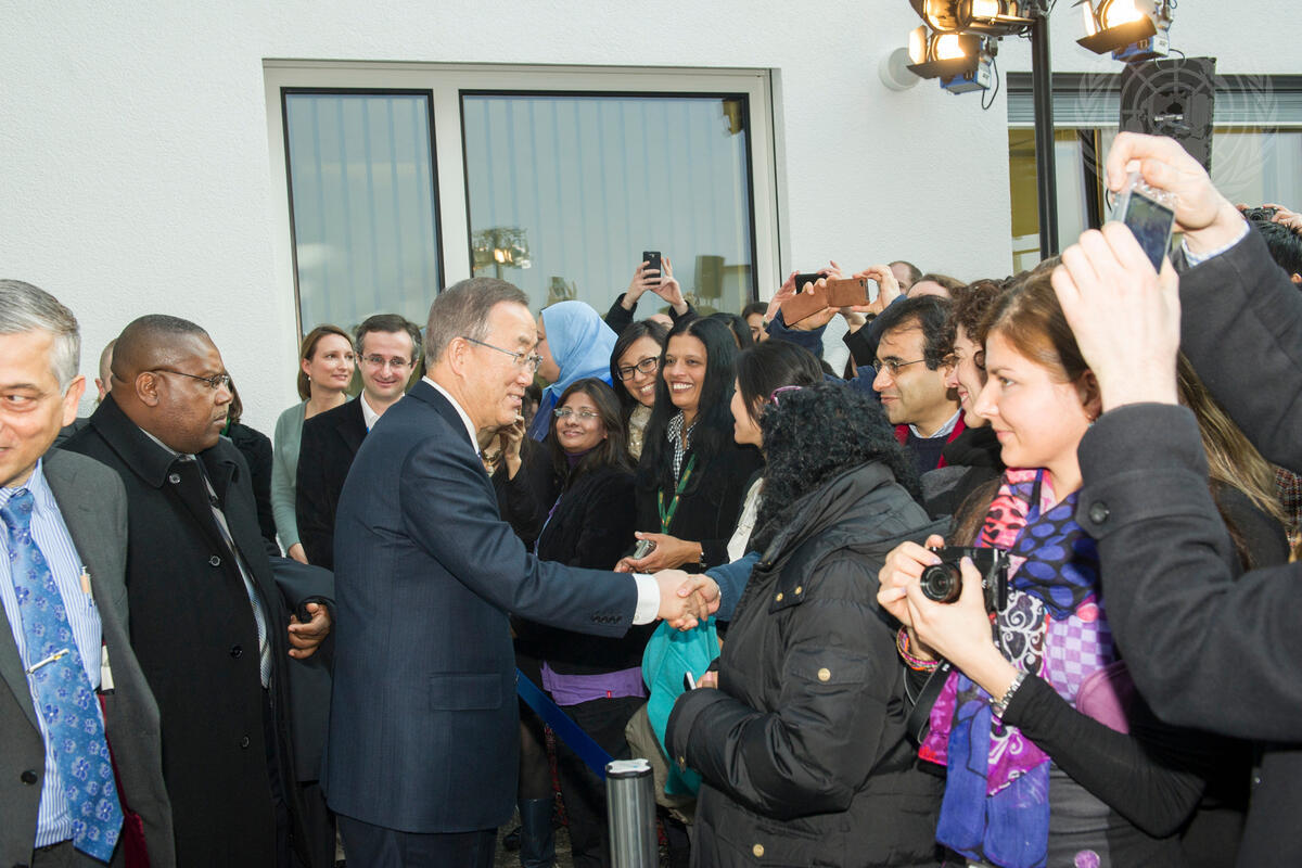 Secretary-General Ban Ki-moon (centre left) shakes hands with staff at the UN Bonn Campus after holding a town hall meeting there today.