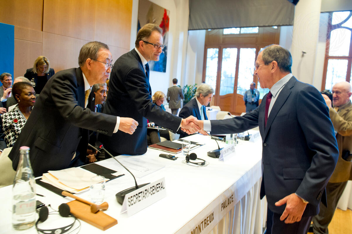 Secretary-General Ban Ki-moon (left) and Michael Møller, Acting Director-General of the United Nations Office at Geneva (UNOG) greet Sergey V. Lavrov (right), Minister for Foreign Affairs of the Russian Federation, at the first day of the high-level segment of the Geneva II Conference on Syria, taking place in Montreux, Switzerland. Both the Syrian Government and the opposition are attending the international conference, which aims to end the nearly three-year-old civil war in Syria.