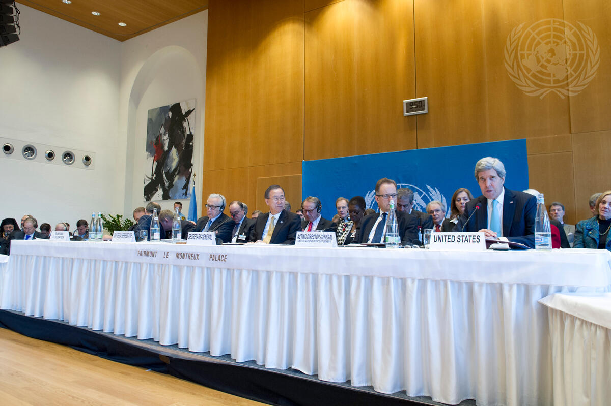 United States Secretary of State John Kerry (right) speaks during the opening of the high-level segment of the Geneva II Conference on Syria, taking place in Montreux, Switzerland. Also convening the international conference that has brought together both the Syrian Government and the opposition in an attempt to end the nearly-three-year civil war in Syria are (from left) Sergey V. Lavrov, Minister for Foreign Affairs of the Russian Federation; Lakhdar Brahimi, Joint Special Representative of the United Nations and the League of Arab States for Syria; Secretary-General Ban Ki-moon; and Michael Møller, Acting Director-General of the United Nations Office at Geneva (UNOG).