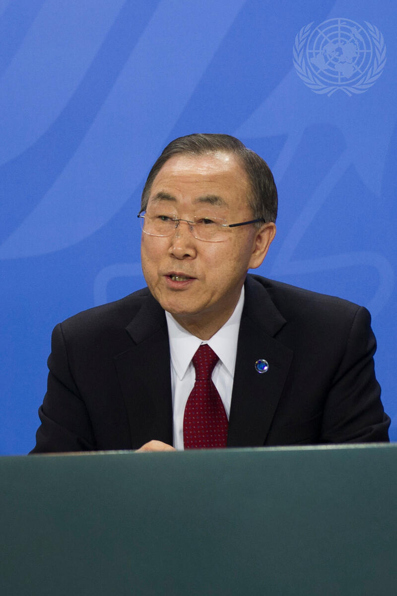 Secretary-General Ban Ki-moon addresses a joint press conference with Angela Merkel, Chancellor of Germany.