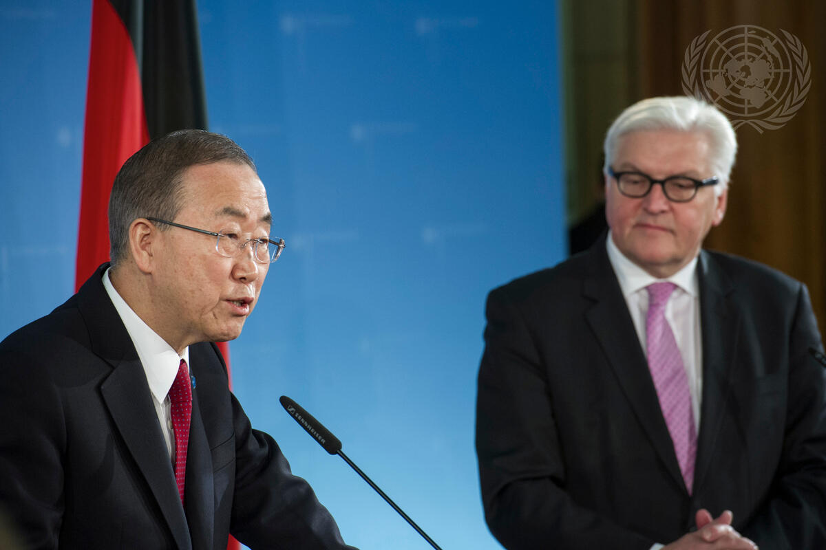 Secretary-General Ban Ki-moon (left) addresses a joint press conference with Frank-Walter Steinmeier, Minister for Foreign Affairs of Germany.