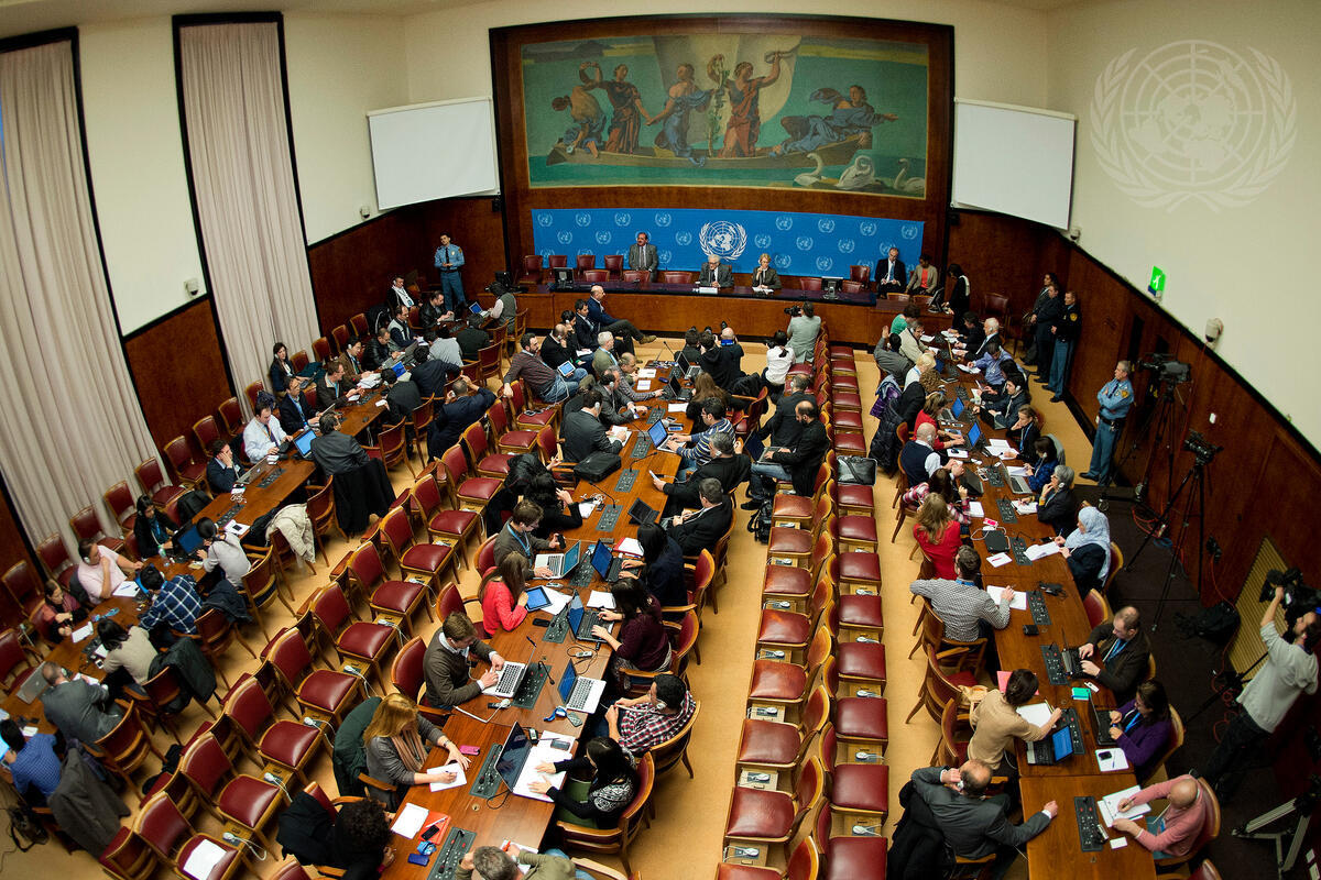 A wide view of the press briefing room at the Palais des Nations, as Lakhdar Brahimi, Joint Special Representative of the UN and the League of Arab States for Syria, briefs journalists on the ongoing Geneva II conference on Syria.