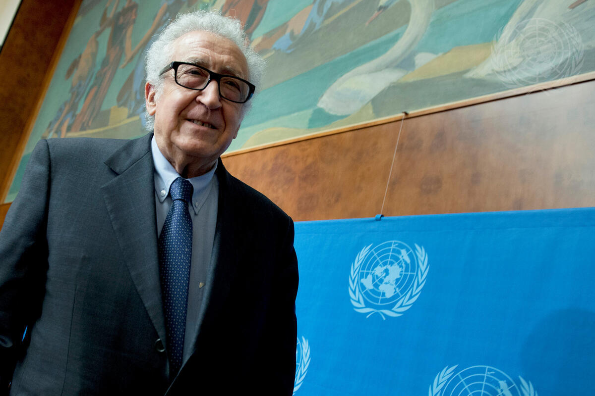 Lakhdar Brahimi, Joint Special Representative of the UN and the League of Arab States for Syria, about to brief journalists at the conclusion of the Geneva II peace talks on Syria.