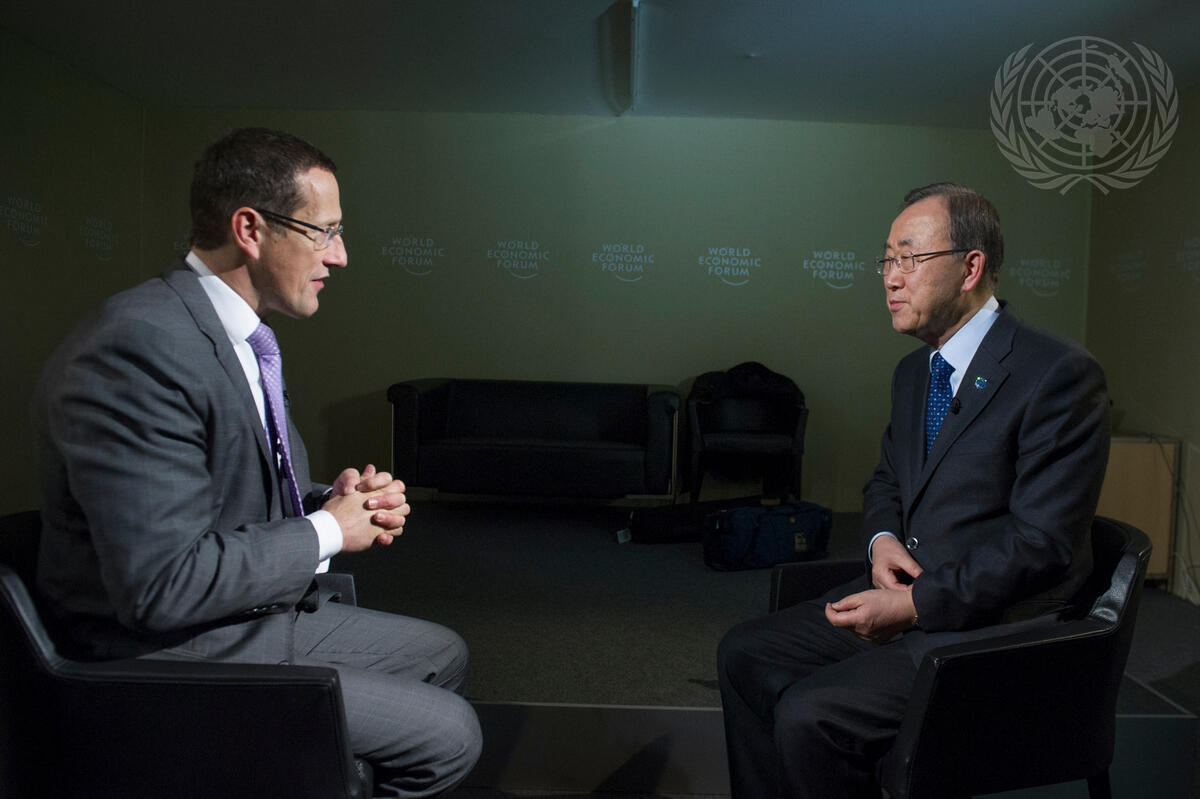 Richard Quest (left), CNN Anchor and Reporter, interviews Ban Ki-moon, Secretary-General of the United Nations, during this year's World Economic Forum in Davos, Switzerland.