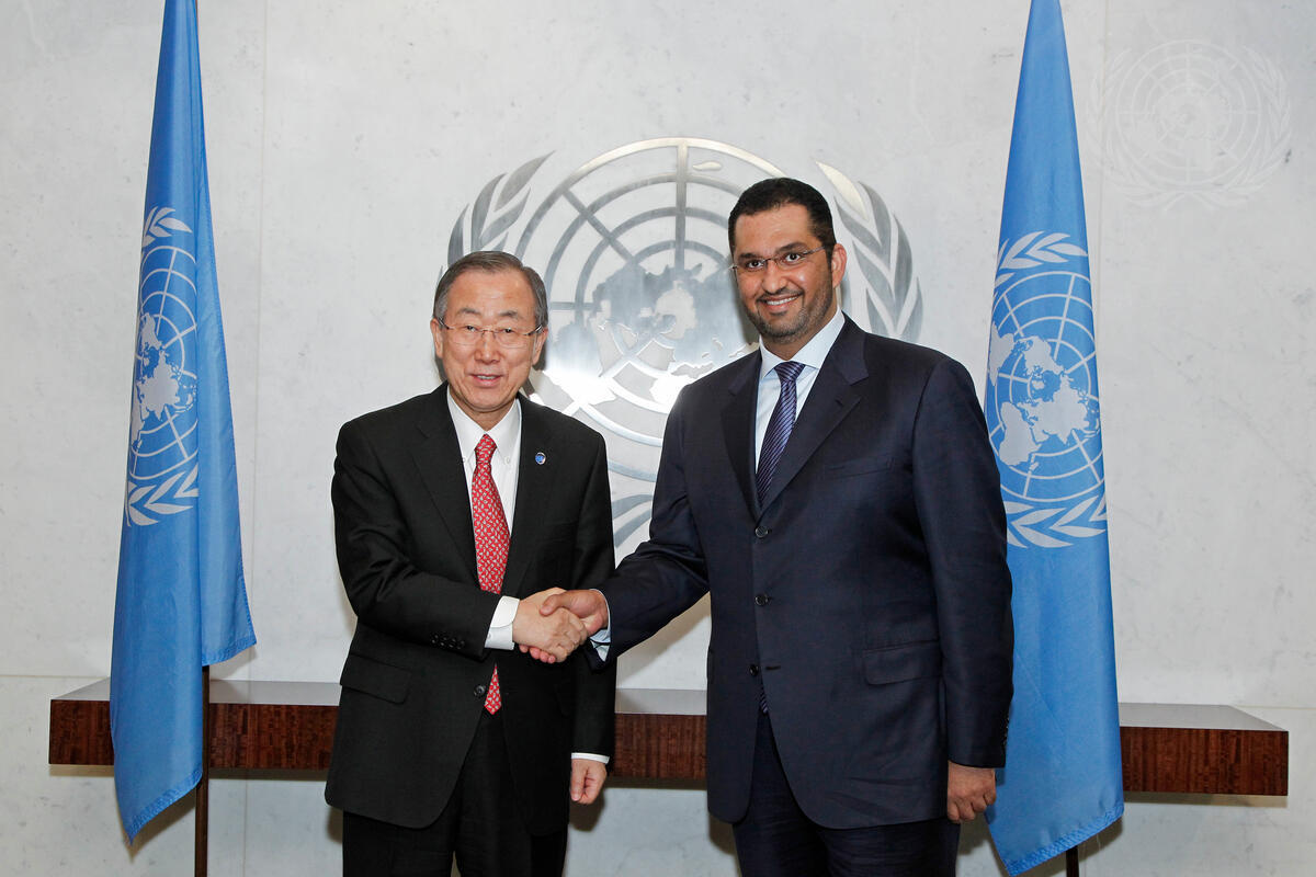 Secretary-General Ban Ki-moon (left) meets with Sultan Ahmed Al Jaber, Minister of State and Special Envoy for Energy and Climate Change of the United Arab Emirates.