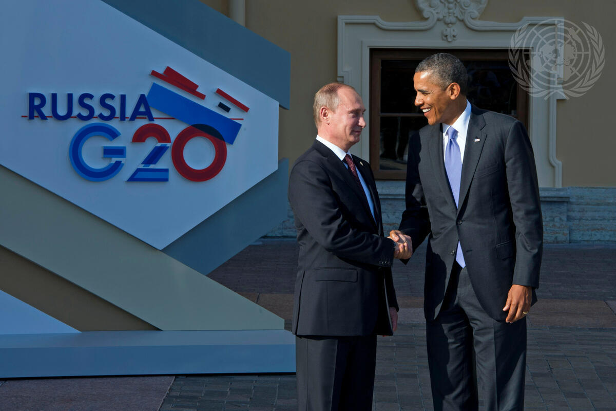 Vladimir V. Putin (left), President of the Russian Federation, welcomes United States President Barack Obama at the Group of 20 (G-20) Summit in St. Petersburg.