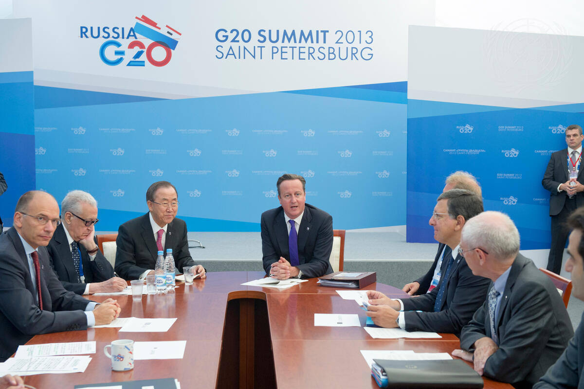 Secretary-General Ban Ki-moon (centre left) addressed a meeting on the humanitarian situation in Syria, chaired by David Cameron (centre right), Prime Minister of the United Kingdom. The meeting was held on the margins of the G-20 Summit in St. Petersburg. The Secretary-General warned that “Ill-considered military action could cause serious and tragic consequences, with an increased threat of further sectarian violence.” Insisting that “we should explore ways to avoid further militarization of the conflict and revitalize the search for a political settlement instead,” he called for renewed efforts to rapidly convene the Geneva conference for Syria as soon as possible. Also attending the meeting was Lakhdar Brahimi (on Mr. Ban’s right), Joint Special Representative of the UN and the League of Arab States for Syria.