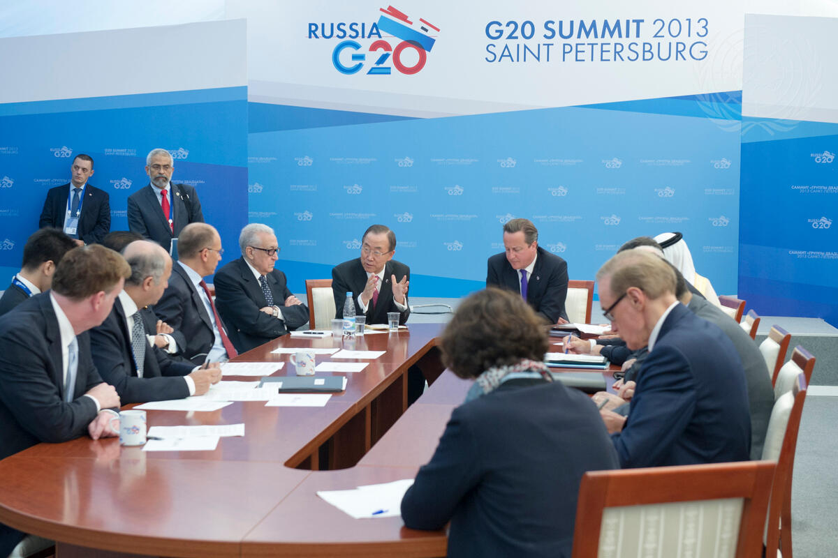 Secretary-General Ban Ki-moon (centre left) addresses a meeting on the humanitarian situation in Syria, chaired by David Cameron (centre right), Prime Minister of the United Kingdom. The meeting was held on the margins of the G-20 Summit in St. Petersburg. The Secretary-General warned that “Ill-considered military action could cause serious and tragic consequences, with an increased threat of further sectarian violence.” Insisting that “we should explore ways to avoid further militarization of the conflict and revitalize the search for a political settlement instead,” he called for renewed efforts to rapidly convene the Geneva conference for Syria as soon as possible. Also attending the meeting was Lakhdar Brahimi (on Mr. Ban’s right), Joint Special Representative of the UN and the League of Arab States for Syria.