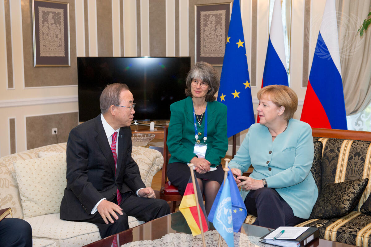Secretary-General Ban Ki-moon (left) meets with Angela Merkel (right), Chancellor of Germany, in St. Petersburg, where the G-20 Summit is taking place.