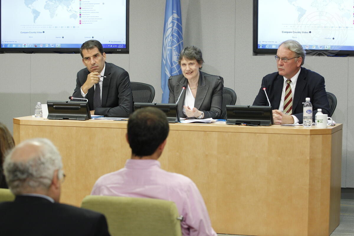 Helen Clark (centre), Administrator of the UN Development Programme (UNDP), speaks at the press conference launching of the United Nations Development Group's (UNDG) Report “One Million Voices: The World We Want” on the Post-2015 Development Agenda. She is flanked by Olav Kjørven (left), Assistant Secretary-General and Director of UNDP’s Bureau for Development Policy, and John Hendra, Assistant Secretary-General and Deputy Executive Director for Policy and Programme of UN-Women.