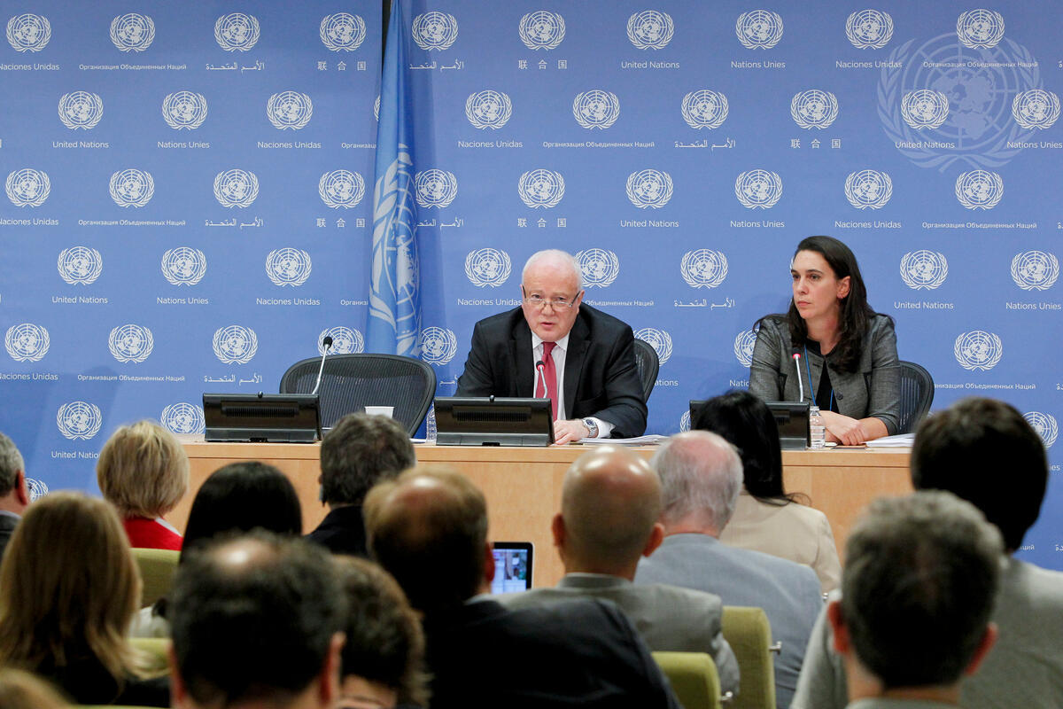 Gary Quinlan (facing camera, left), Permanent Representative of Australia to the UN and President of the Security Council for the month of September, briefs journalists on the Council’s programme of work for the month.