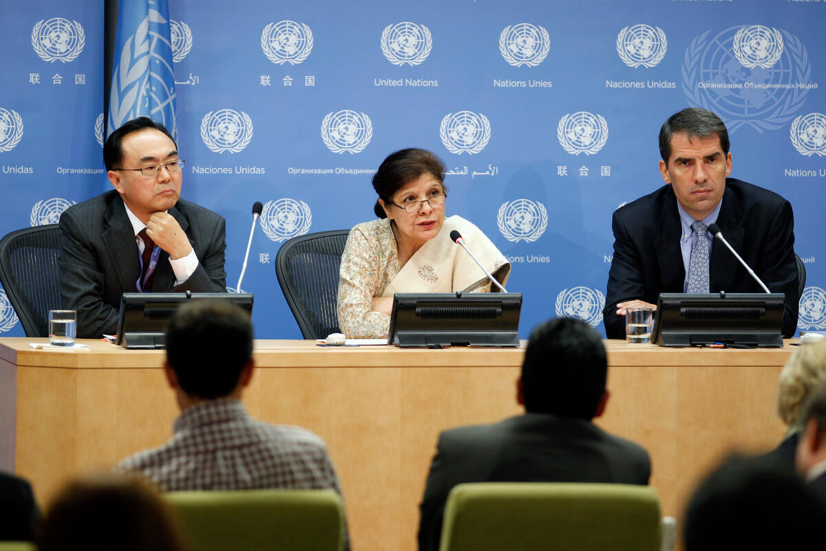 Shamshad Akhtar (centre), Assistant Secretary-General for Economic Development in the Department of Economic and Social Affairs (DESA), addresses a press conference launching the 2013 report of the the Millennium Development Goals (MDG) Gap Task Force entitled, “The Global Partnership for Development: The Challenge We Face”. She is flanked by Pingfan Hong (left), Acting Director of the Development Policy and Analysis Division, DESA; and Olav Kjørven, Assistant Secretary-General and Director of the Bureau for Development Policy at the UN Development Programme.