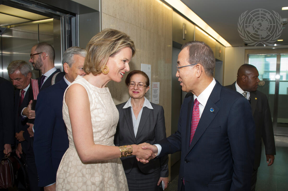 Secretary-General Ban Ki-moon (right) welcomes Queen Mathilde of Belgium and Didier Reynders (left of Queen Mathilde), Belgium’s Vice-Prime Minister and Minister for Foreign Affairs, as they arrive at Mr. Ban’s office.