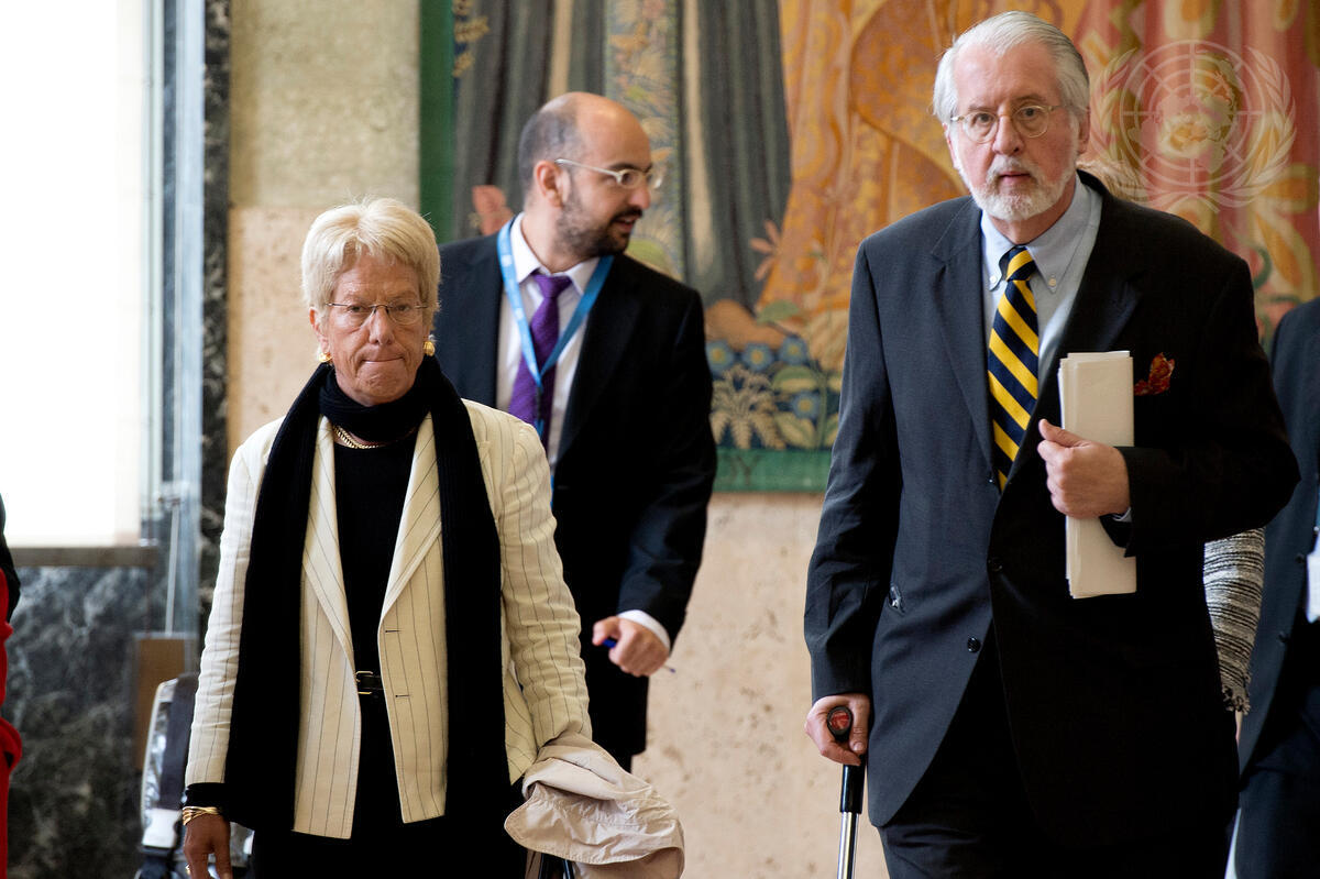 Paulo Sérgio Pinheiro (right), Chairman of the Independent International Commission of Inquiry on the Syrian Arab Republic, and Carla del Ponte, member of Commission, arrive at a press conference after briefing the twenty-fourth Session of the Human Rights Council on their latest report.