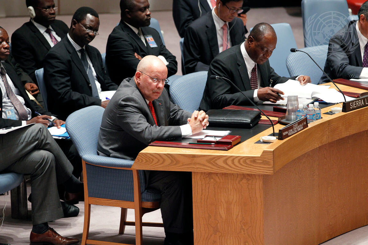 Guillermo Rishchynski (centre), Permanent Representative of Canada to the UN, and Chair of the Sierra Leone Configuration of the Peacebuilding Commission, during the Security Council meeting on the situation in Sierra Leone.