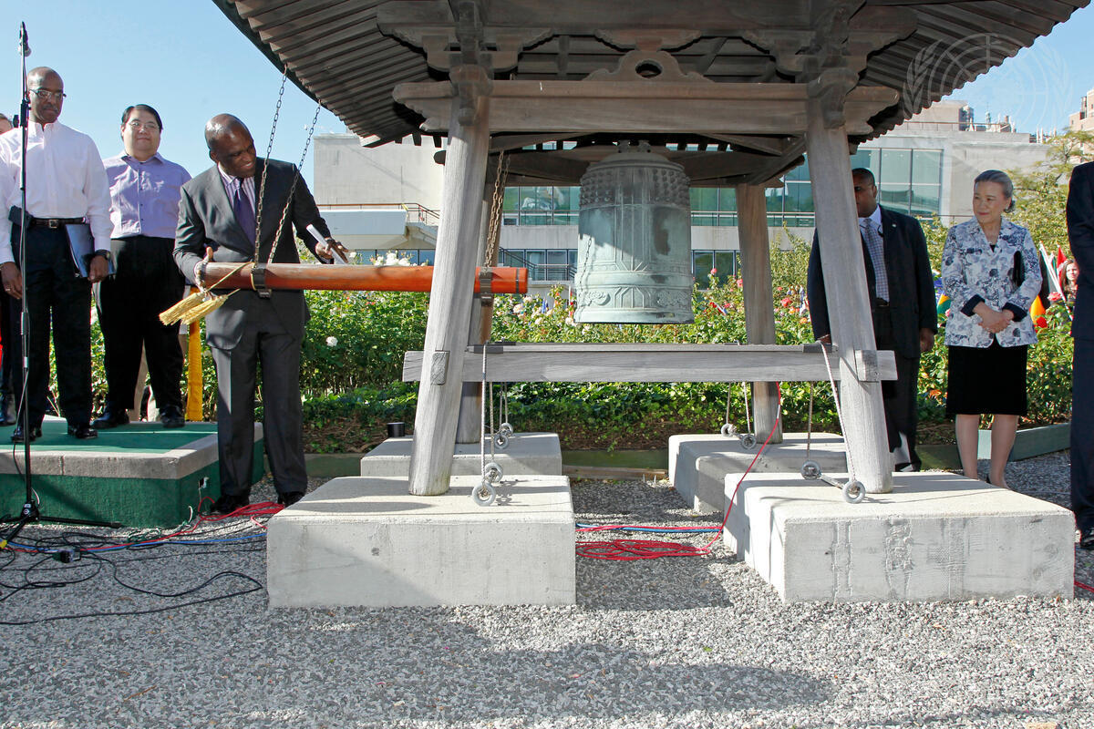 John Ashe (third from left), President of the sixty-eighth session of the General Assembly, rings the Peace Bell at the annual ceremony held at UN hedquarters in observance of the International Day of Peace (21 September).