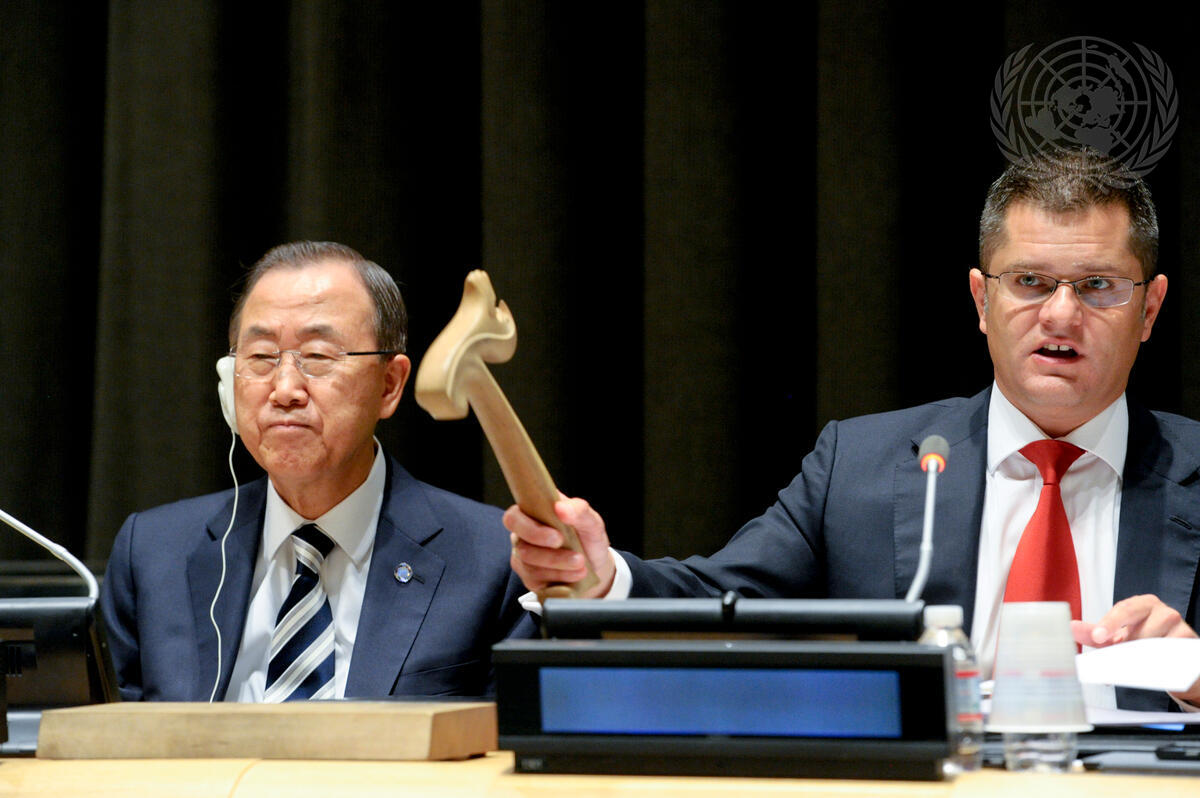 Vuk Jeremic (right), outgoing President of the General Assembly, officially closing the ninety-ninth and final Plenary meeting of the sixty-seventh session of the General Assembly. Ban Ki-moon, Secretary-General of the United Nations, sitting to his left.