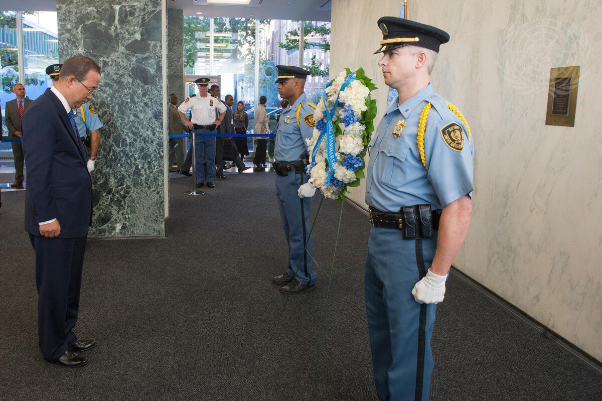 Secretary-General Ban Ki-moon (left) lays a wreath in memory of former Secretary-General Dag Hammarskjöld, at a ceremony marking the 52nd anniversary of Hammarskjöld’s death.