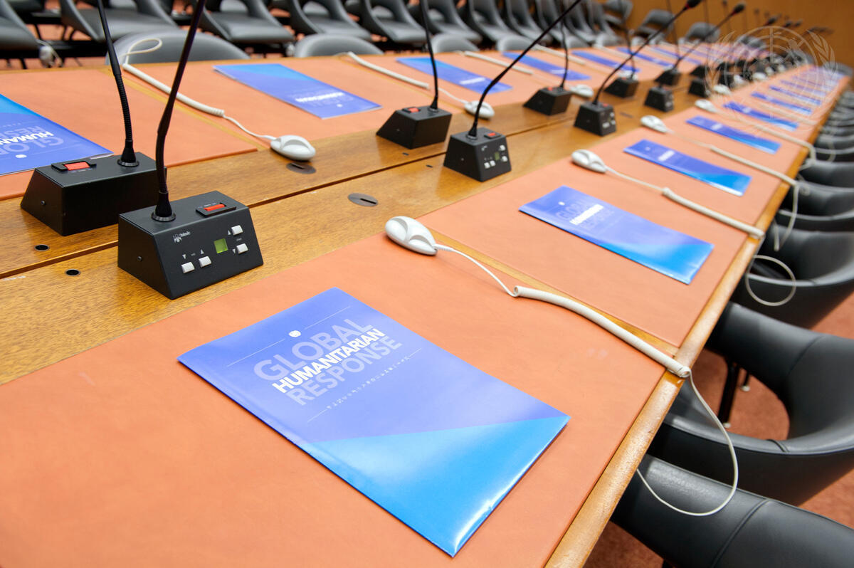 A view the conference room with documents ready for the launch of the UN’s strategic humanitarian response plans and requirements for 2014.