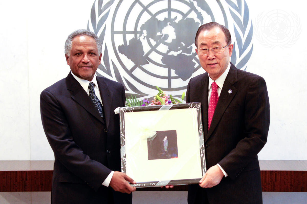 Daffa-Alla Elhag Ali Osman (left), Permanent Representative of the Republic of the Sudan to the UN, pays a farewell call on Secretary-General Ban Ki-moon.