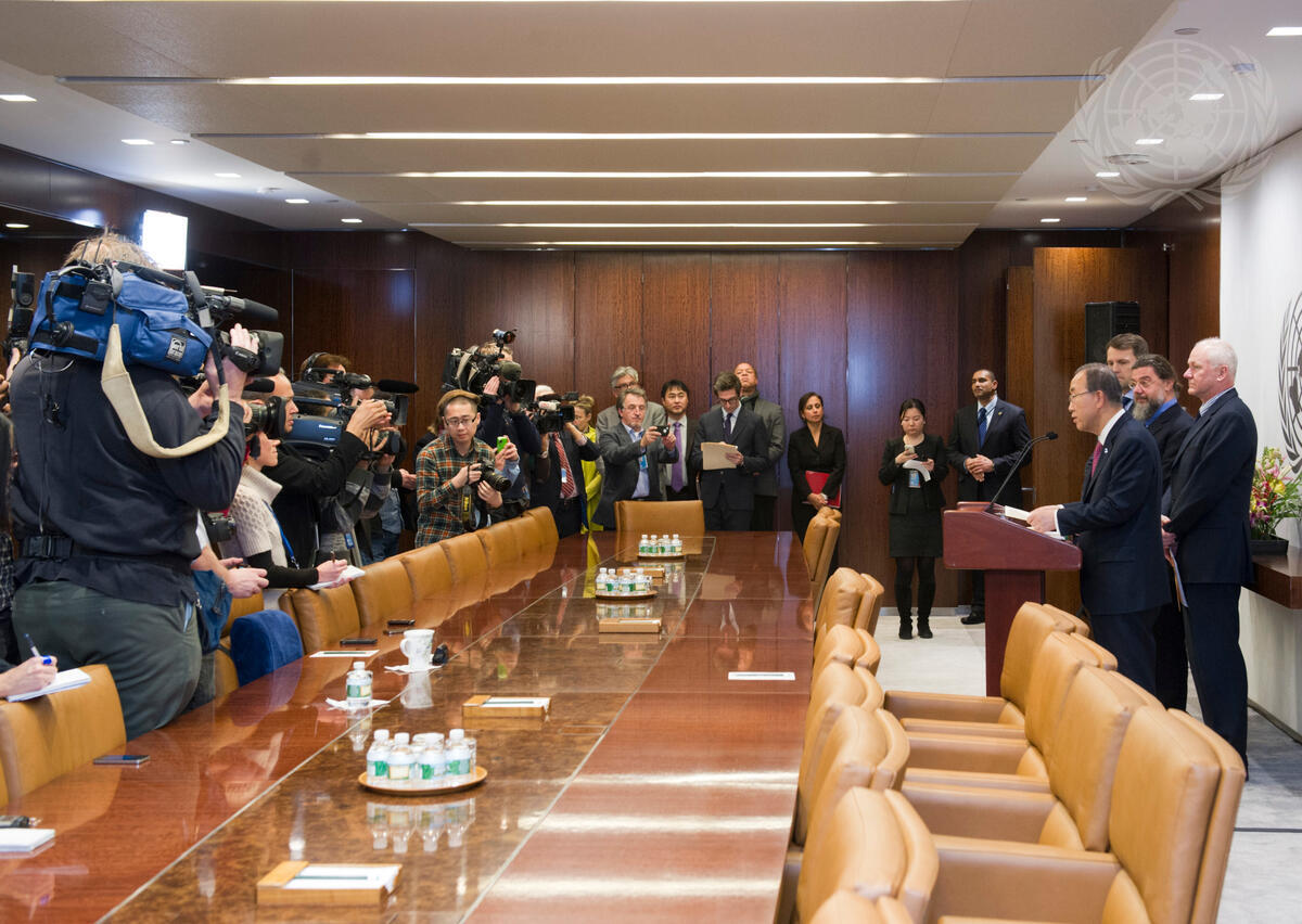 The Secretary-General (at lectern at right) speaks to journalists after receiving the report. Also pictured standing with him (from left): team leaders Scott Cairns and Maurizio Barbeschi from the Organisation for the Prohibition of Chemical Weapons (OPCW) and the World health Organization (WHO), respectively; and ?ke Sellström (right), head of the UN investigation mission.
