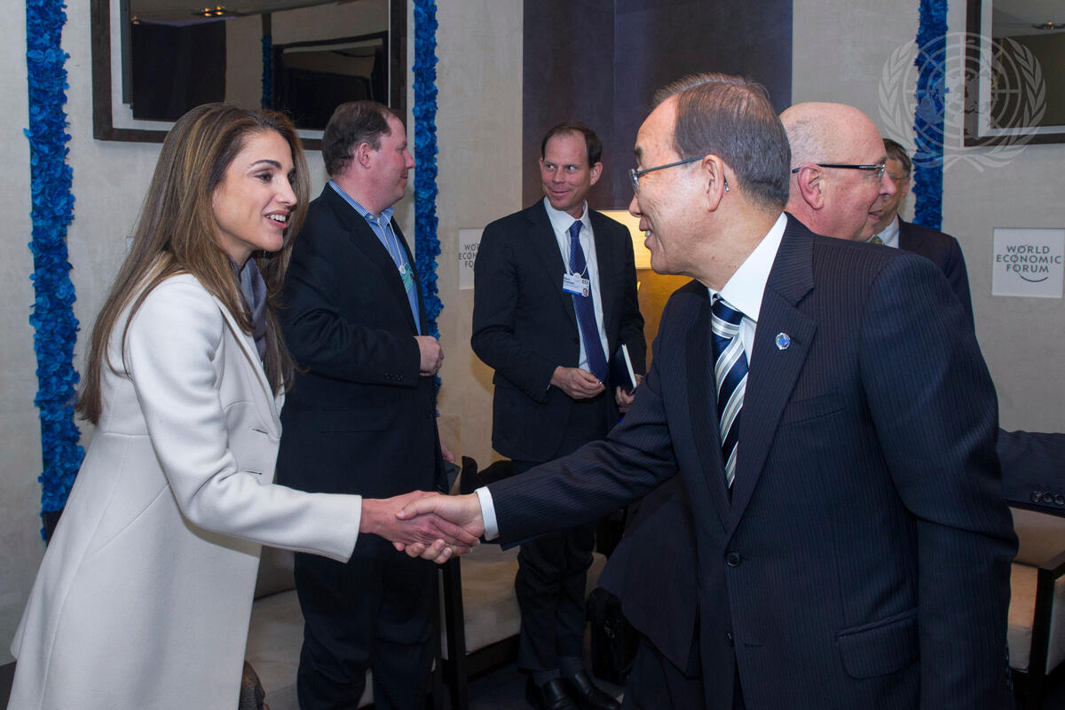 Secretary-General Ban Ki-moon (right) greets Queen Rania Al Abdullah of the Hashemite Kingdom of Jordan, World Economic Forum Foundation Board Member, on the sidelines of the Forum’s “The Global Development Outlook” event, in Davos, Switzerland.