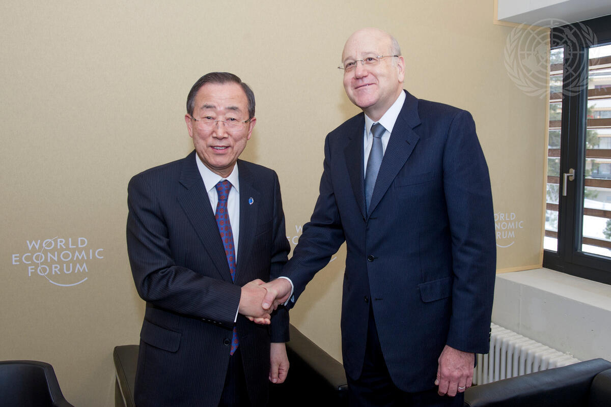 Secretary-General Ban Ki-moon (right) meets with Najib Mikati, Prime Minister of Lebanon during this year's World Economic Forum in Davos, Switzerland.