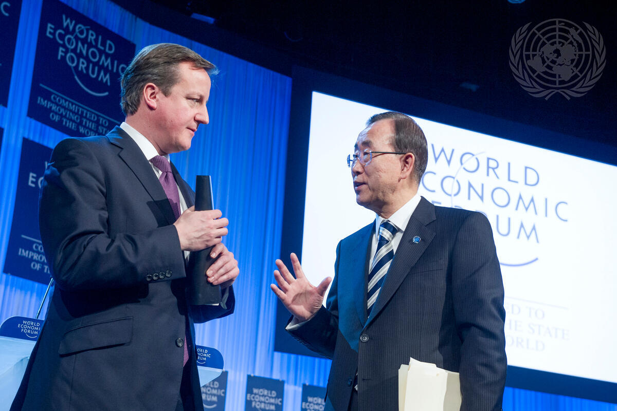 Secretary-General Ban Ki-moon (right) meets with David Cameron, Prime Minister of the United Kingdom, during the annual meeting of the World Economic Forum taking place in Davos, Switzerland, on 22-26 January.