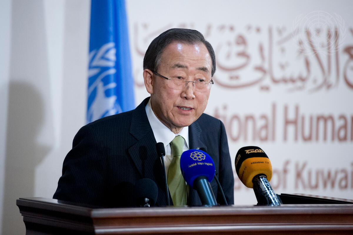 Secretary-General Ban Ki-moon speaks during a joint press briefing with Kuwait’s Foreign Minister, Sheikh Sabah Khalid Al Hamad Al Sabah, following the International Humanitarian Pledging Conference for Syria in Kuwait City.