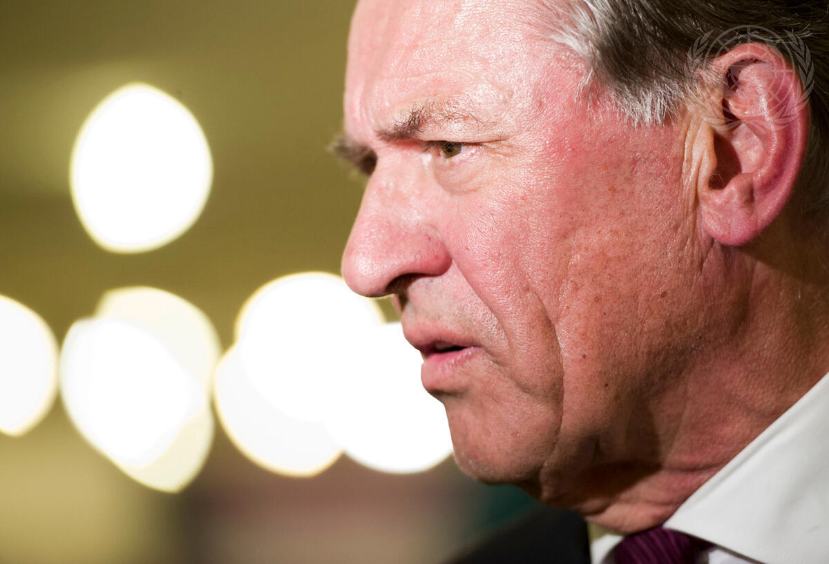 Jan Eliasson, Deputy Secretary-General of the United Nations, delivering remarks at the opening of “Libya in Transition: Helping to Build a New Democratic Libya."" The exhibit features the work of Iason Athanasiadis, a photographer for the United Nations Support Mission in Libya (UNSMIL), and includes contributions from the United Nations Mine Action Service, courtesy of photographer Giovanni Diffidenti.
