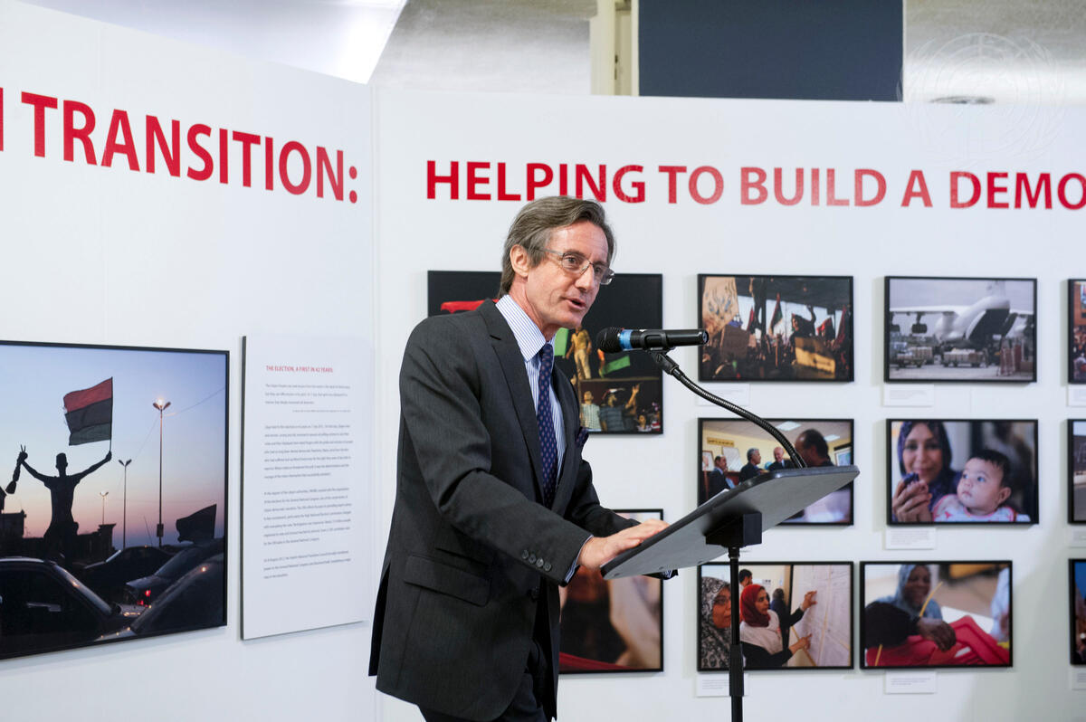 Peter Launsky-Tieffenthal, Under-Secretary-General for Communications and Public Information, making introductory remarks at the opening of “Libya in Transition: Helping to Build a New Democratic Libya."" The exhibit features the work of Iason Athanasiadis, a photographer for the United Nations Support Mission in Libya (UNSMIL), and includes contributions from the United Nations Mine Action Service, courtesy of photographer Giovanni Diffidenti.
