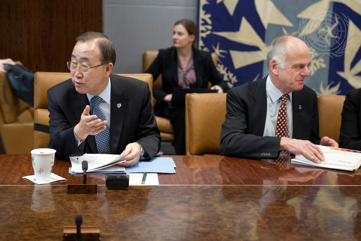 Secretary-General Ban Ki-moon (left) chairs a meeting of the High-Level Task Force on Global Food Security, partly conducted via video link. At right is David Nabarro, Coordinator of the Task Force and Special Representative of the Secretary-General on Food Security and Nutrition.