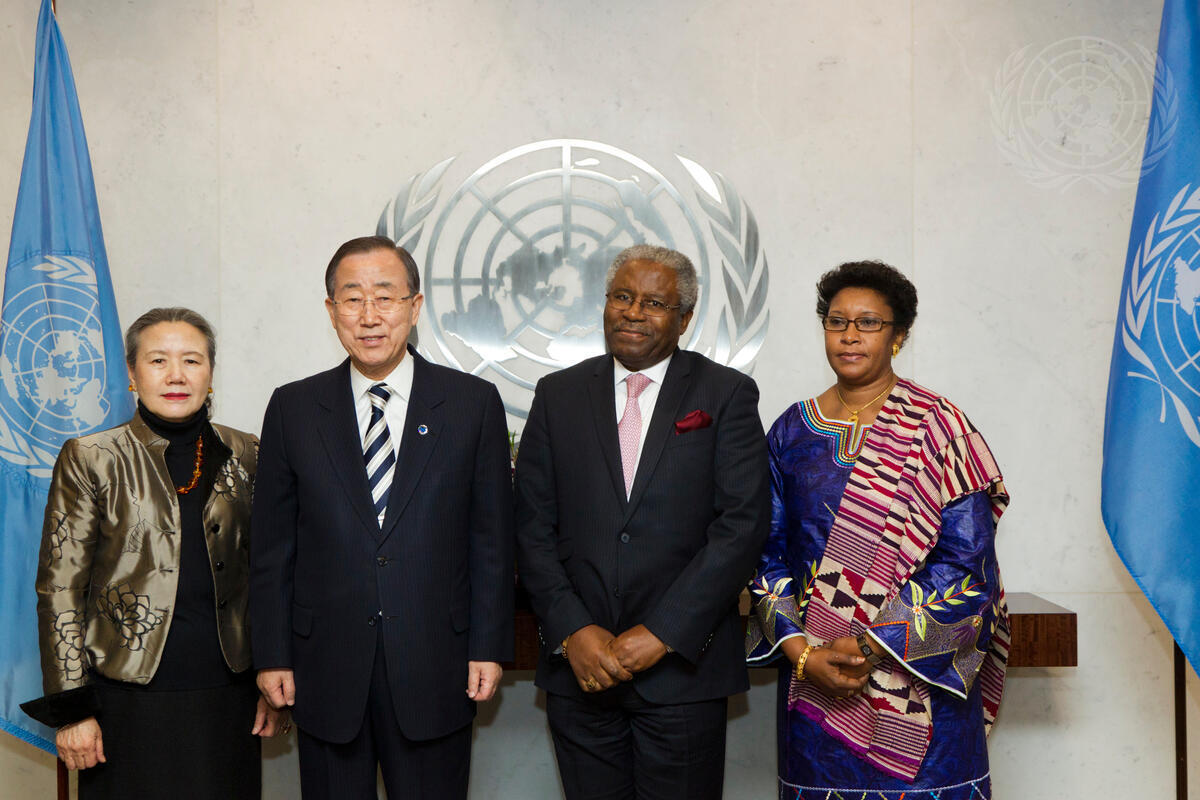 Secretary-General Ban Ki-moon (centre left) and and his wife Yoo Soon-taek (left) meet with David Daroll Tommy (centre right), new Permanent Representative of Gambia to the UN, and his wife, Darling Eugenia Tommy, after receiving his credentials at UN Headquarters in New York.