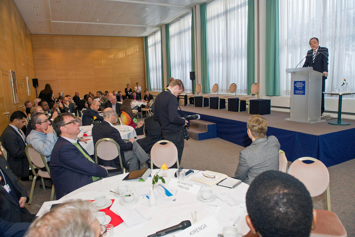 Secretary-General Ban Ki-moon (at lectern) delivers the closing remarks at the meeting of the Water Resources Group (WRG) during the annual meeting of the World Economic Forum taking place in Davos, Switzerland, on 22-26 January.