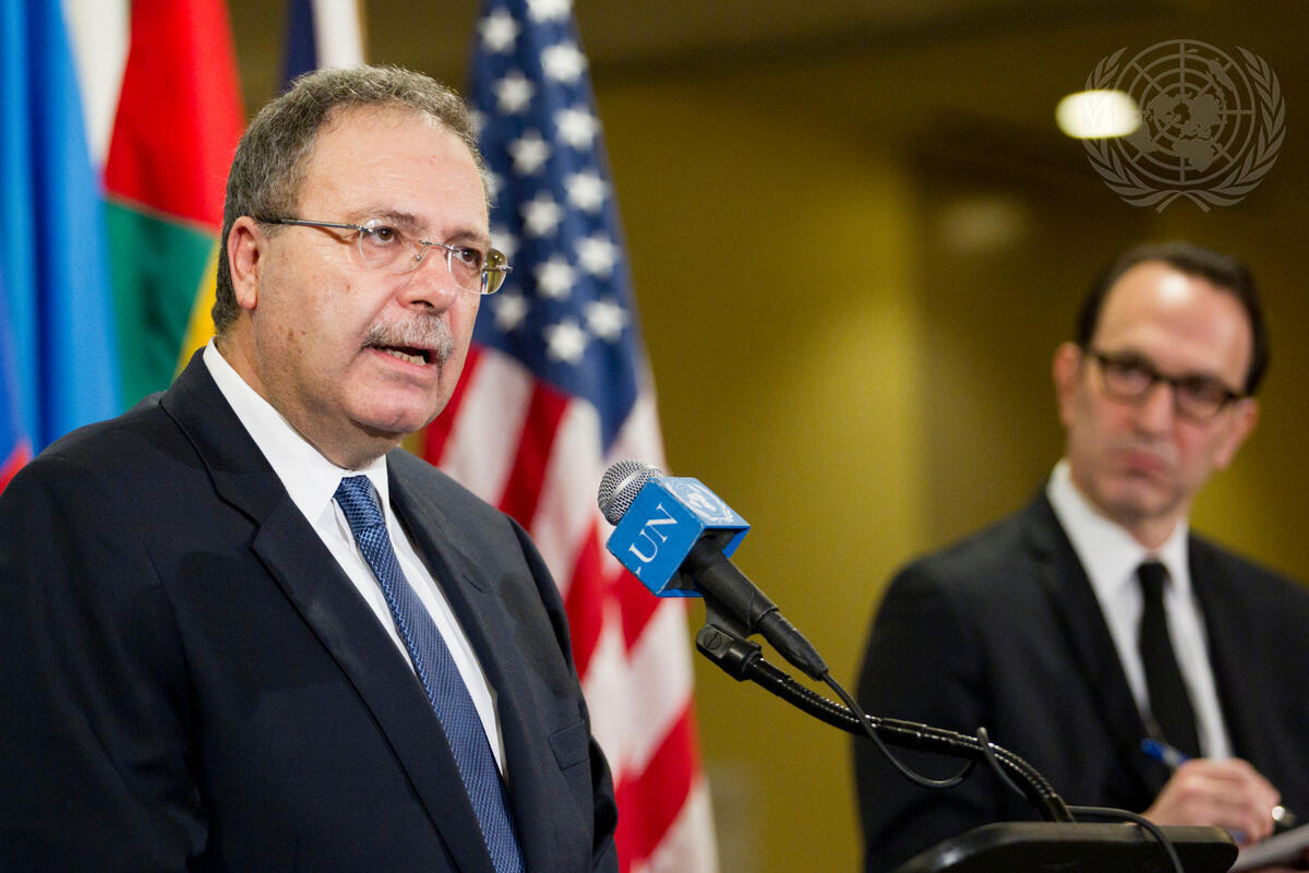 Tarek Mitri (left), Special Representative of the Secretary-General and Head of the UN Support Mission in Libya (UNSMIL), speaks to journalists following Security Council meetings on the situation in that country.