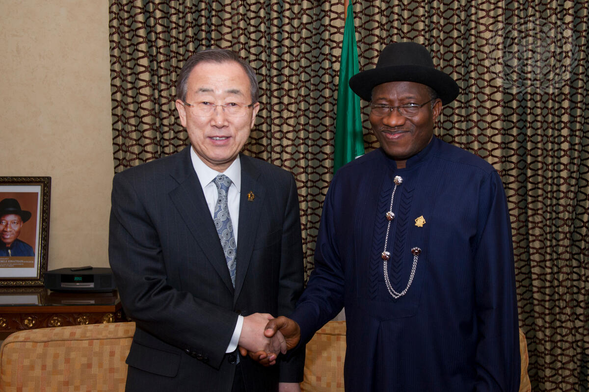 Secretary-General Ban Ki-moon (right) meets with Goodluck Ebele Jonathan, President of Nigeria.