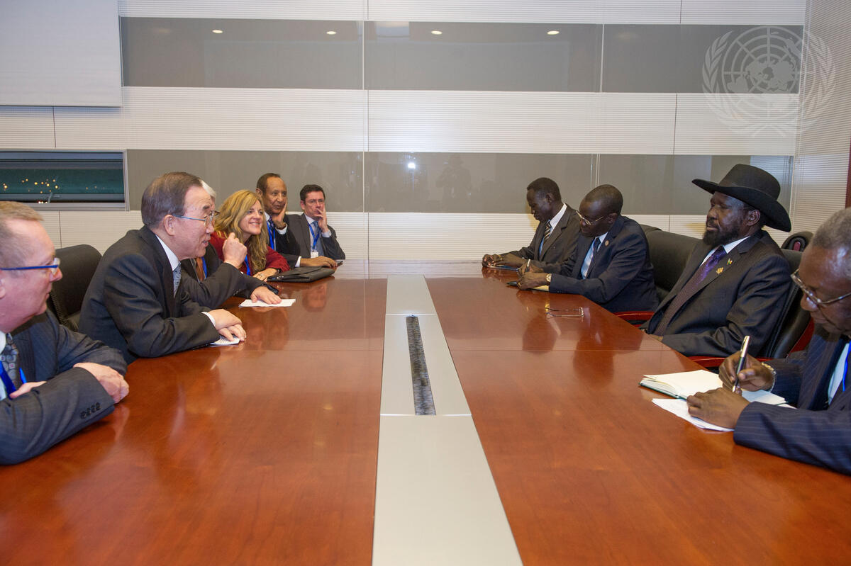 Secretary-General Ban Ki-moon (second from left) meets with Salva Kiir Mayardit (second from right), President of the Republic of South Sudan.
