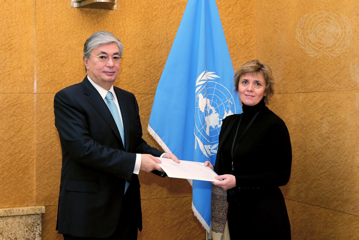 Carole Lanteri, new Permanent Representative of the Principality of Monaco to the United Nations Office at Geneva (UNOG), presents her credentials to UNOG Director-General Kassym-Jomart Tokayev.