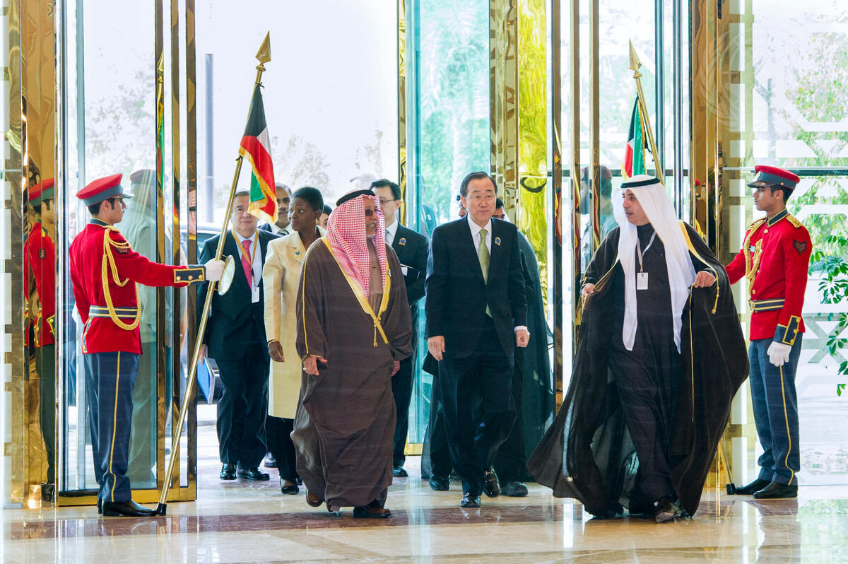 Secretary-General Ban Ki-moon (front, centre) arrives at the International Humanitarian Pledging Conference for Syria in Kuwait City, Kuwait.