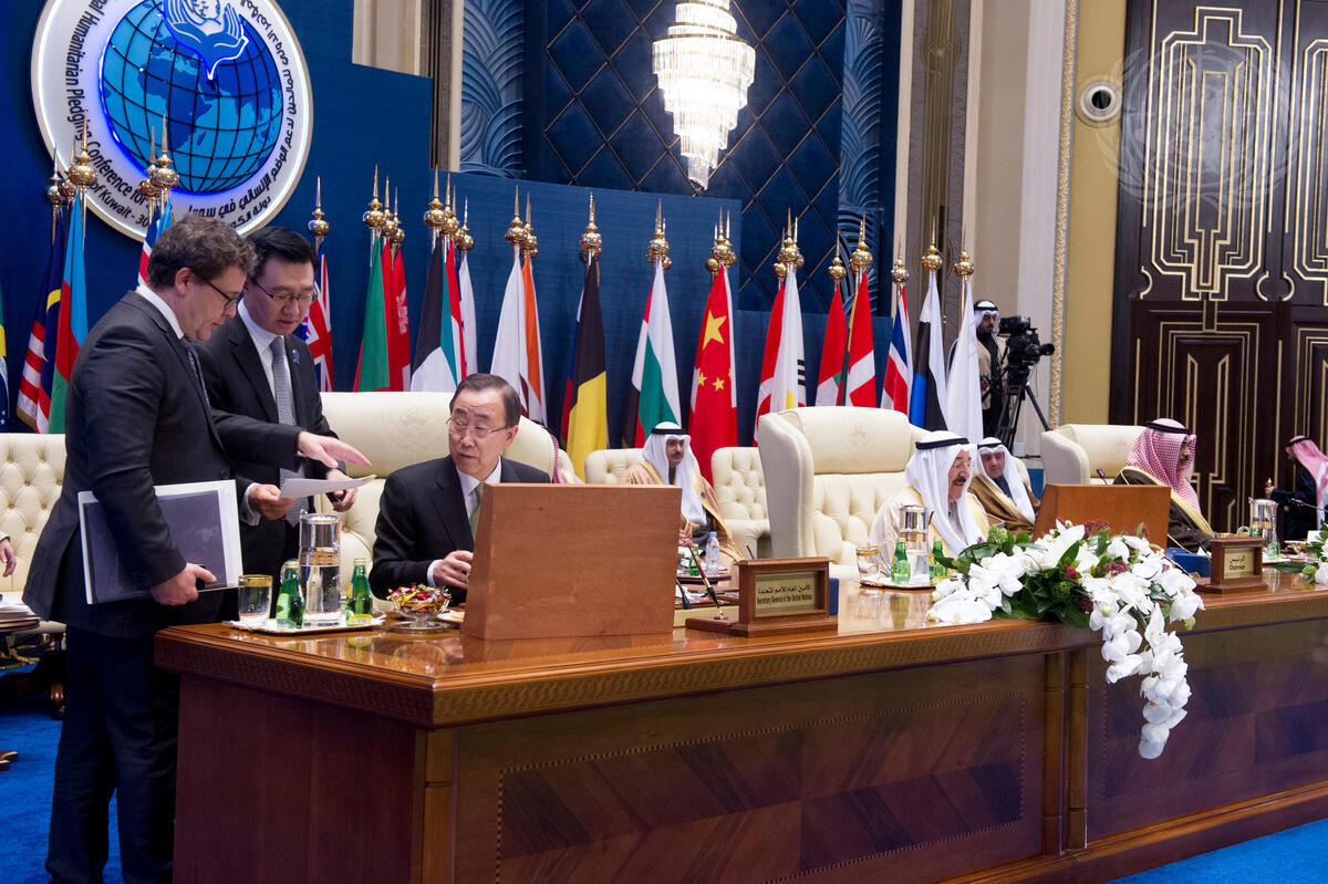 To the right of Mr. Ban is Sheikh Sabah Al-Ahmad Al-Jaber Al-Sabah, Amir of the State of Kuwait.