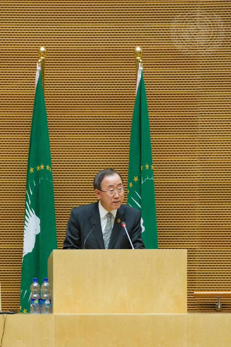Secretary-General Ban Ki-moon addresses the African Union Summit taking place on the 50th anniversary of the founding of the Organization of African Unity.