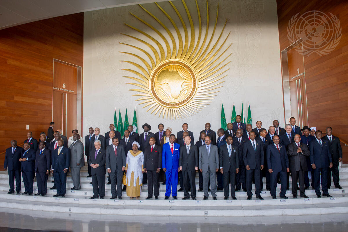 Secretary-General Ban Ki-moon (front row, centre right) poses for a group photo with leaders attending the African Union Summit, which marks the 50th anniversary of the founding of the Organization of African Unity.