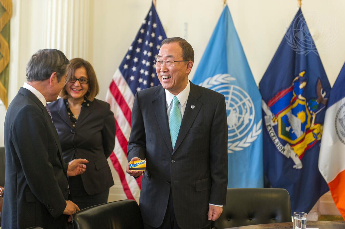 Secretary-General Ban Ki-moon took the Metropolitan Transportation Authority’s (MTA) number 6 underground train to City Hall, where he met with New York City Mayor Bill de Blasio.