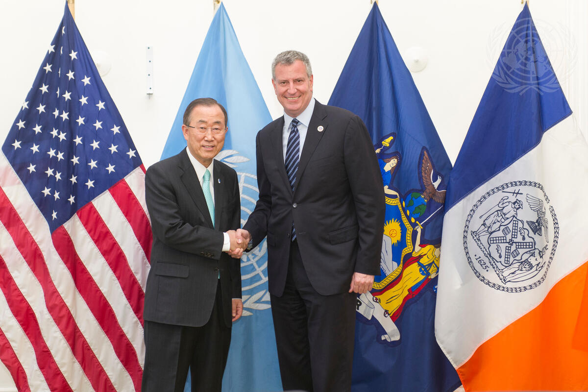 Secretary-General Ban Ki-moon (left) meets with Bill de Blasio, Mayor of New York City, at City Hall.