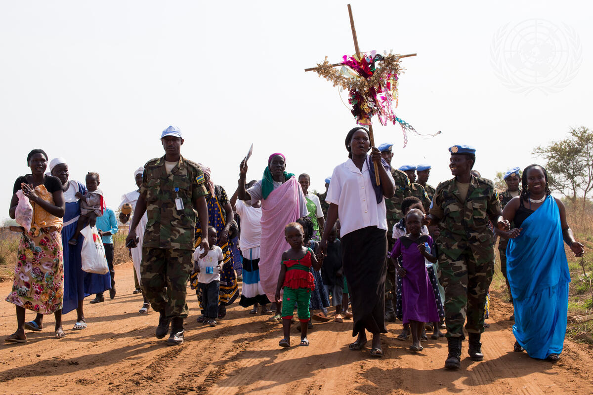 A procession of Kapuri Primary School pupils, community residents and members of the UNMISS Rwandan contingent arriving for the handover ceremony.