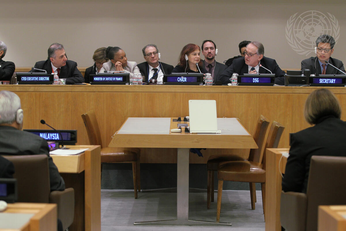 Deputy Secretary-General Jan Eliasson (second from right on dais) speaking during the open briefing by the Security Council Counter-Terrorism Committee (CTC) on ""The importance of the rule of law in countering the current terrorist threat”. On his right is Raimonda Murmokaite, Permanent Representative of Lithuania to the UN and Chair of the CTC. Also pictured on dais (from left): Jean-Paul Laborde, Executive Director of the Counter-Terrorism Committee Executive Directorate (CTED); Christiane Taubira, French Minister of Justice and Keeper of the Seals.