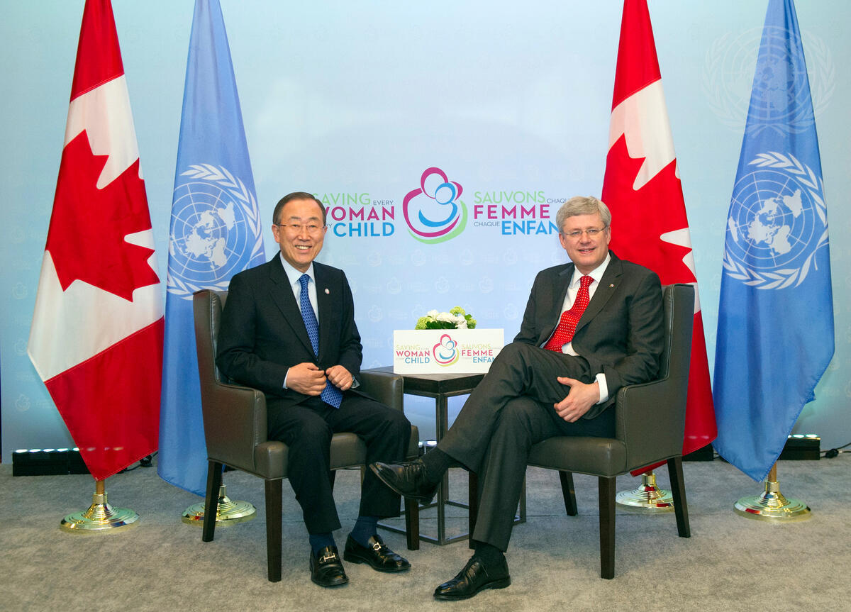 Secretary-General Ban Ki-moon (left) meets with Stephen Harper, Prime Minister of Canada. Mr. Ban is to address the following day the 28-30 May Global Summit in support of the “Every Woman Every Child” initiative on maternal, newborn and child health, hosted by the Prime Minister in Toronto.