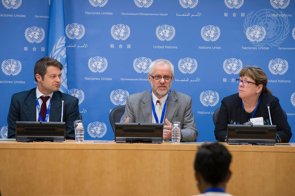 Simon Trace (centre), Chief Executive Officer of the non-governmental organisation (NGO) Practical Action, addresses a press conference on prospects for energy access and the launch of the Poor People’s Energy Outlook 2014 report by his organization. He is flanked by Aaron Leopold (left), Global Energy Advocate at Practical Action; and Susan McDade, Country Action Team Leader in the Sustainable Energy for All (SE4All) Initiative established by Secretary General Ban Ki Moon.